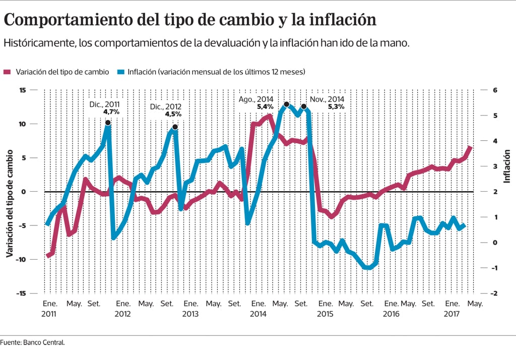 Empero, se puede notar que cuando se da una caída en el precio del dólar, también se registra una tendencia a la baja en los precios internos, como ocurrió durante febrero del 2015 y buena parte del 2016.