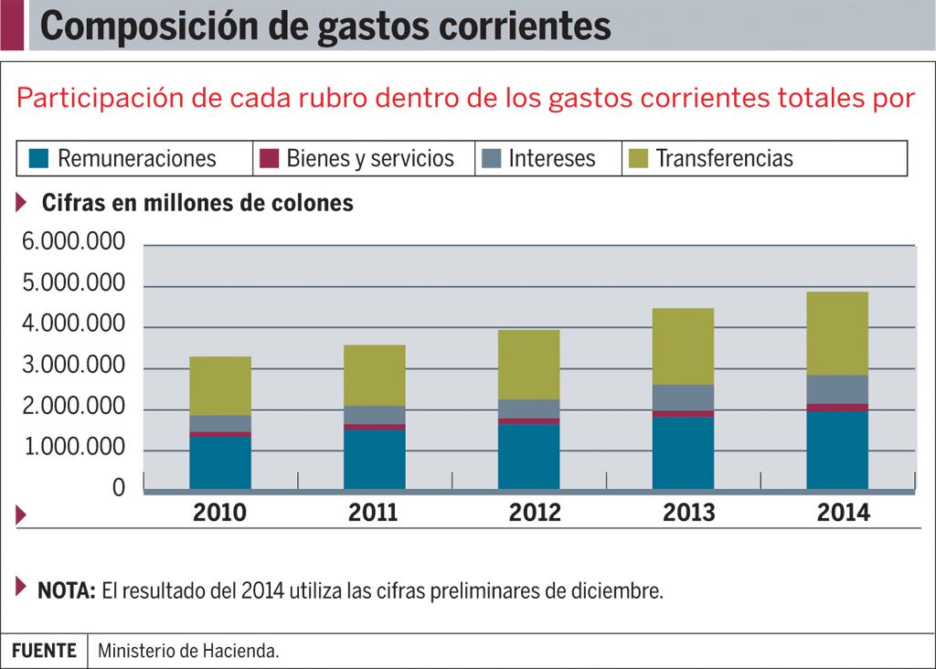 La primera son precisamente los intereses de la deuda externa (¢95.983 millones), que subieron 53,6% en el 2014, por encima del 33% del 2013.