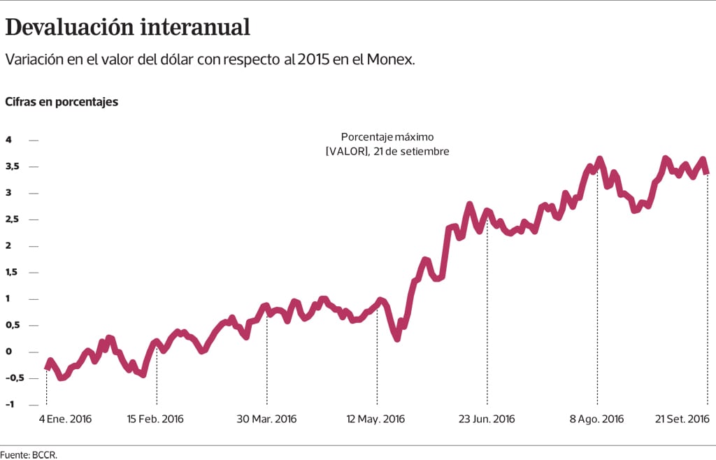 Este año, el BCCR ha dado un poco más de libertad al tipo de cambio y ha permitido ese incremento. Por ejemplo, el 1 de marzo el precio era de ¢537,28 por dólar y el pasado 13 de octubre estaba en ¢555 en el Mercado de Monedas Extranjeras (Monex).