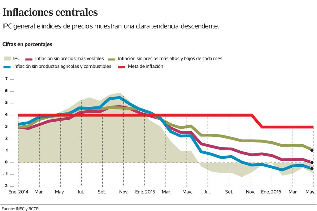 La meta de mantener una inflación entre el 2% y el 4% este año debería permanecer sin cambios por lo que resta del 2016, a pesar de que Costa Rica suma 12 meses de variaciones interanuales negativas en los precios.