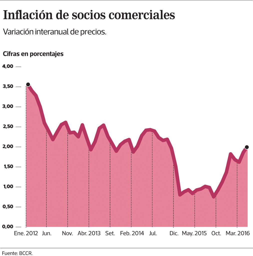 Una de las más visibles es la inflación de los principales socios (países) comerciales de Costa Rica. De acuerdo con la medición que hace el mismo BCCR, la inflación promedio de este grupo de naciones tiene una tendencia de aumento desde octubre del año pasado hasta mayo del 2016.