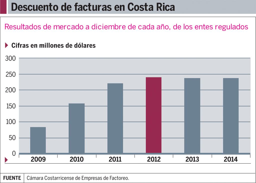 El descuento de facturas cerró con una cartera de $237 millones a diciembre del año pasado, misma cifra que reportó en el 2013, según datos de la Cámara Costarricense de Empresas de Factoreo (CCEF), basados en información suministrada por sus agremiados y por la Superintendencia General de Entidades Financieras (Sugef).