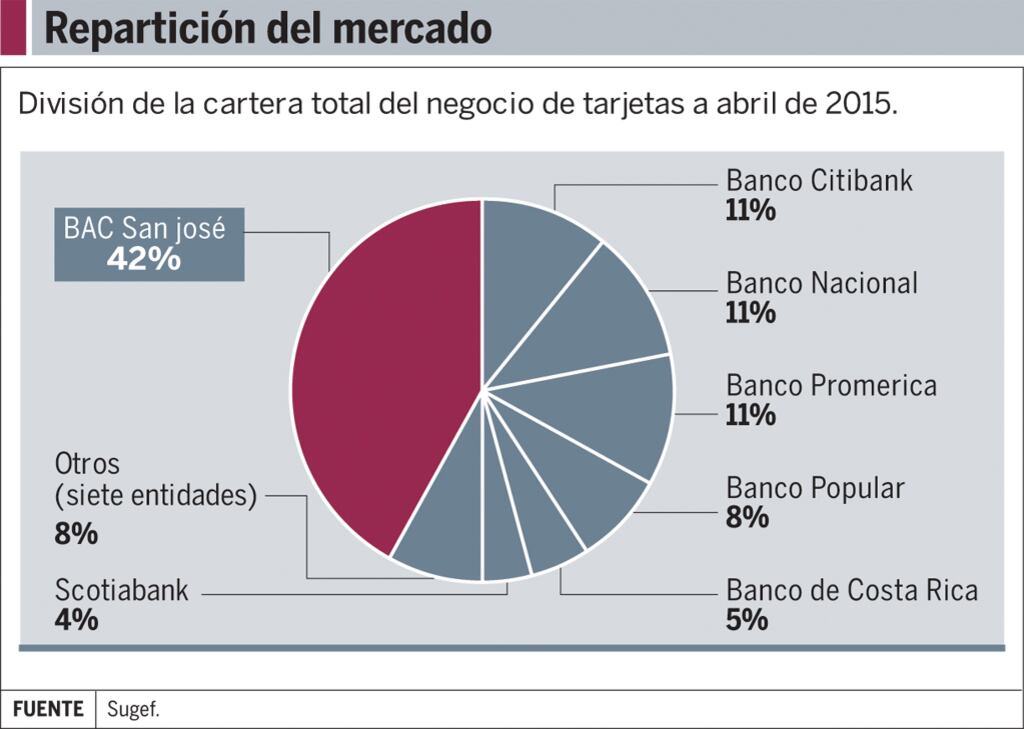El líder de este mercado es BAC Credomatic con ¢315.010 millones a su favor y su saldo aumentó un 19%. Le sigue Citibank con ¢87.588 millones, con un repunte del 5% en el último año.