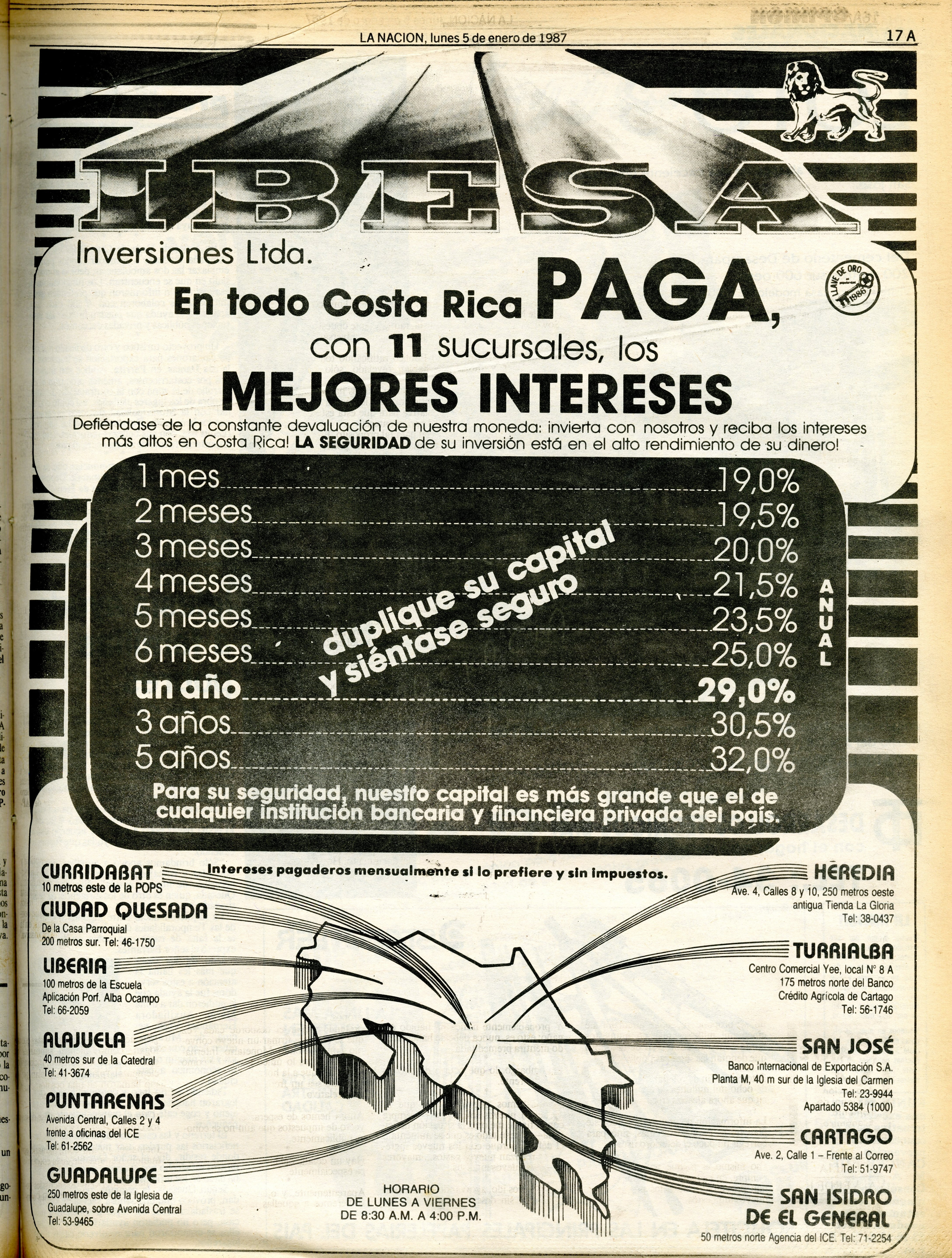 A finales de noviembre de 1987, el Organismo de Investigación Judicial (OIJ) realizó procesos indagatorios en cinco financieras, cuatro de ellas por presunta quiebra fraudulenta y la otra porque el gerente supuestamente cometió estafa y huyó del país.