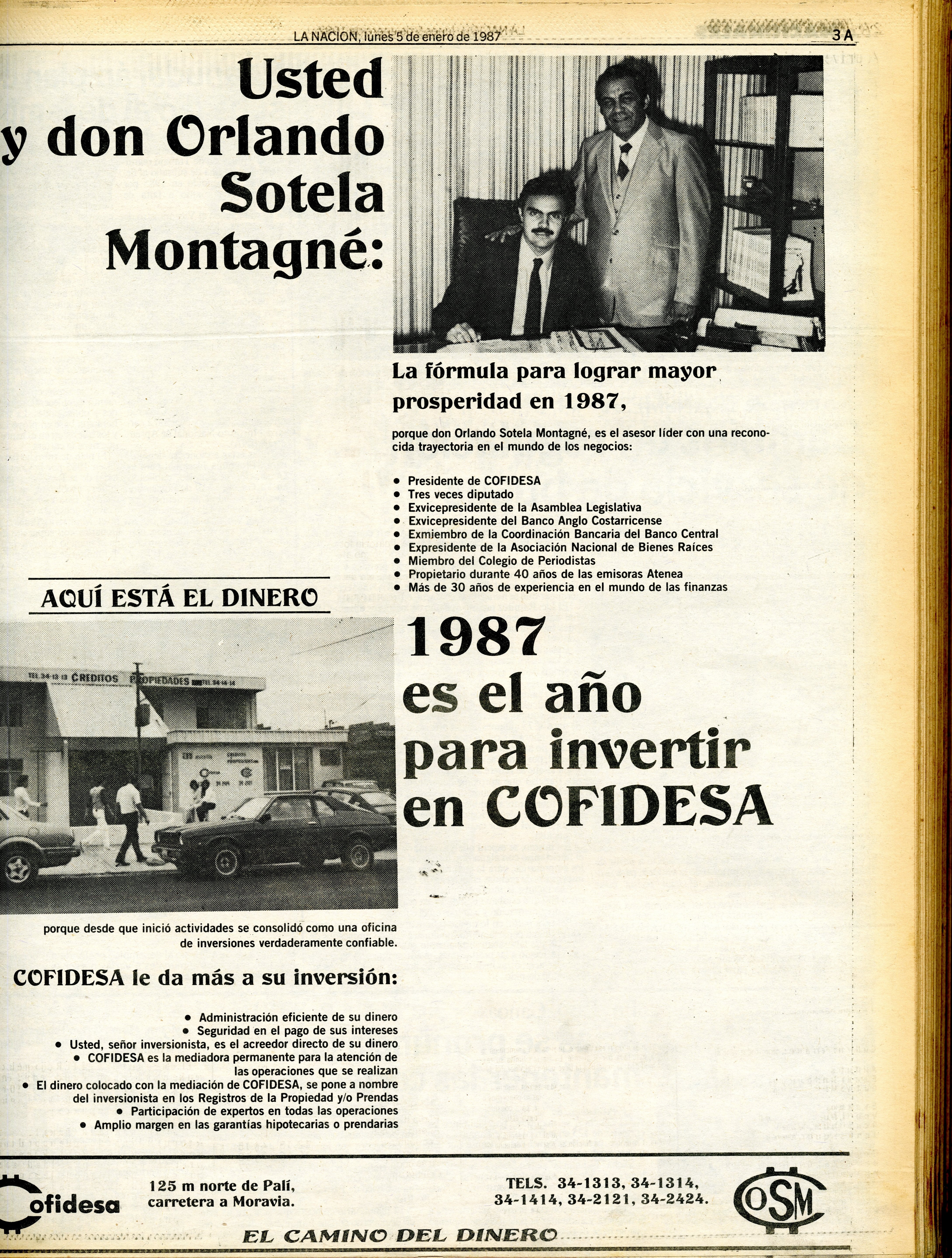 “Aquí está la diferencia!! (sic) En toda actividad hay un líder… Usted lo conoce! Usted sabe dónde está! Don Orlando Sotela Montagné”, se leía en otro anuncio que apareció en La Nación del 25 de noviembre de 1987.