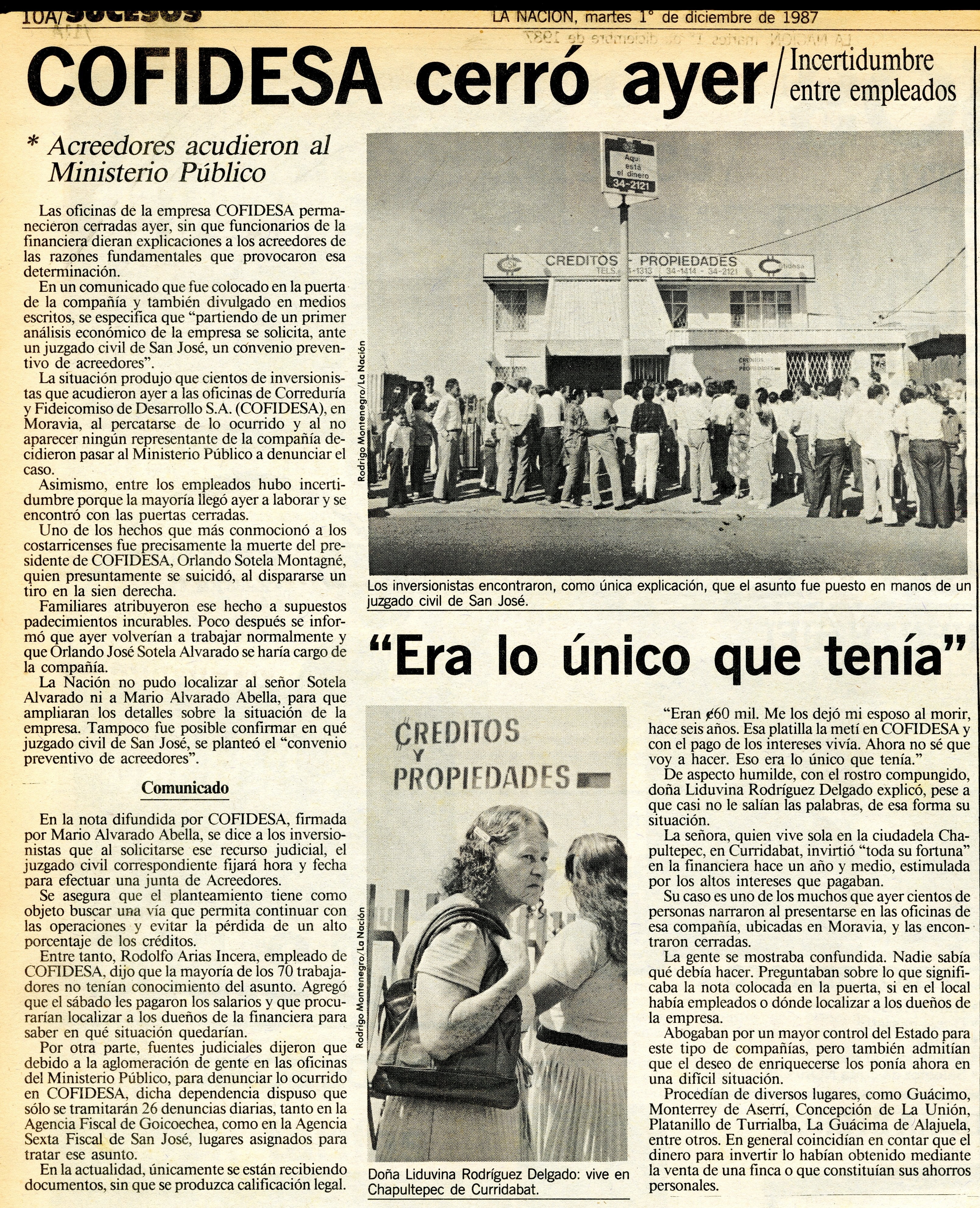 En el hito que engloba la quiebra de financieras en Costa Rica, uno de los casos más sonados fue el de Cofidesa. Pese a que fue declarada en quiebra hasta enero de 1988, la empresa cerró sus puertas el 30 de noviembre de 1987, cinco días después de la muerte de su presidente, Orlando Sotela Montagné.