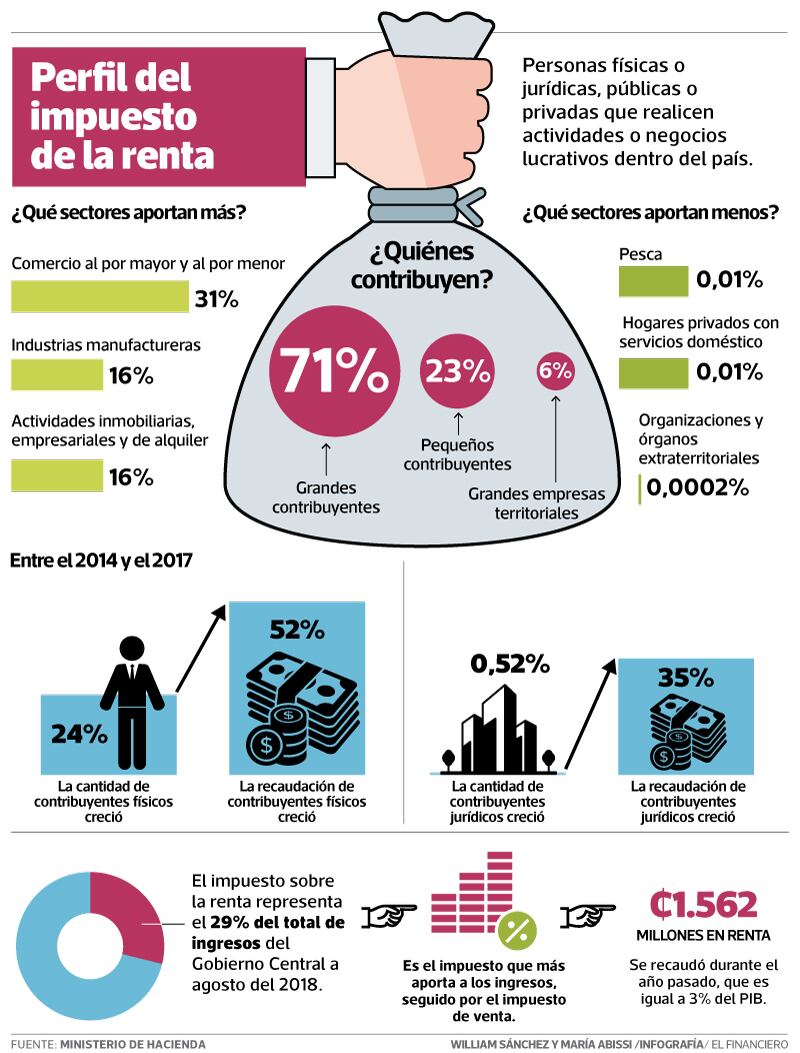 Los pequeños contribuyentes aportan un 23% al total de la recaudación de renta, especialmente personas físicas, mientras que las grandes empresas territoriales (activo total superior o igual a ¢25 millones) en conjunto con los grandes contribuyentes (activo total superior o igual a ¢40 millones) aportan el 77% restante.
