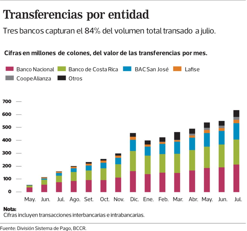 A la vez, el valor promedio de cada movimiento alcanzó los ¢18.027. Las transferencias entre distintos bancos reportan una cifra más alta.
