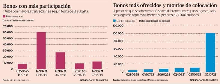 El monto total que alcanzó a atraer fue ₡100.477 millones, que es casi el total de las colocaciones realizadas durante los dos meses. Es decir, el resto de instrumentos anunciados en estas subastas carecieron de interés por parte de inversionistas.