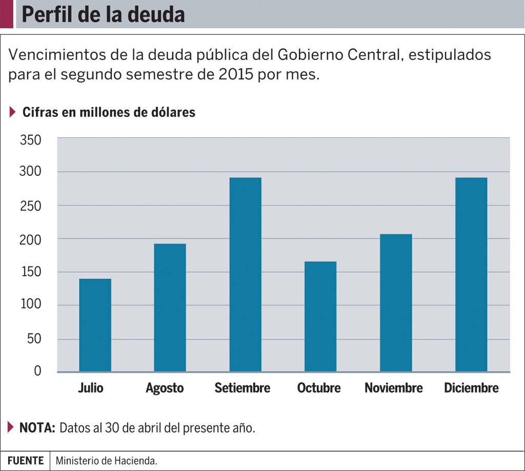 En el segundo semestre de este 2015, los mayores vencimientos de títulos valores del Gobierno llegarán en setiembre ($290,3 millones) y diciembre ($289,4 millones), según datos al cierre de abril, publicados en el sitio web de Hacienda.