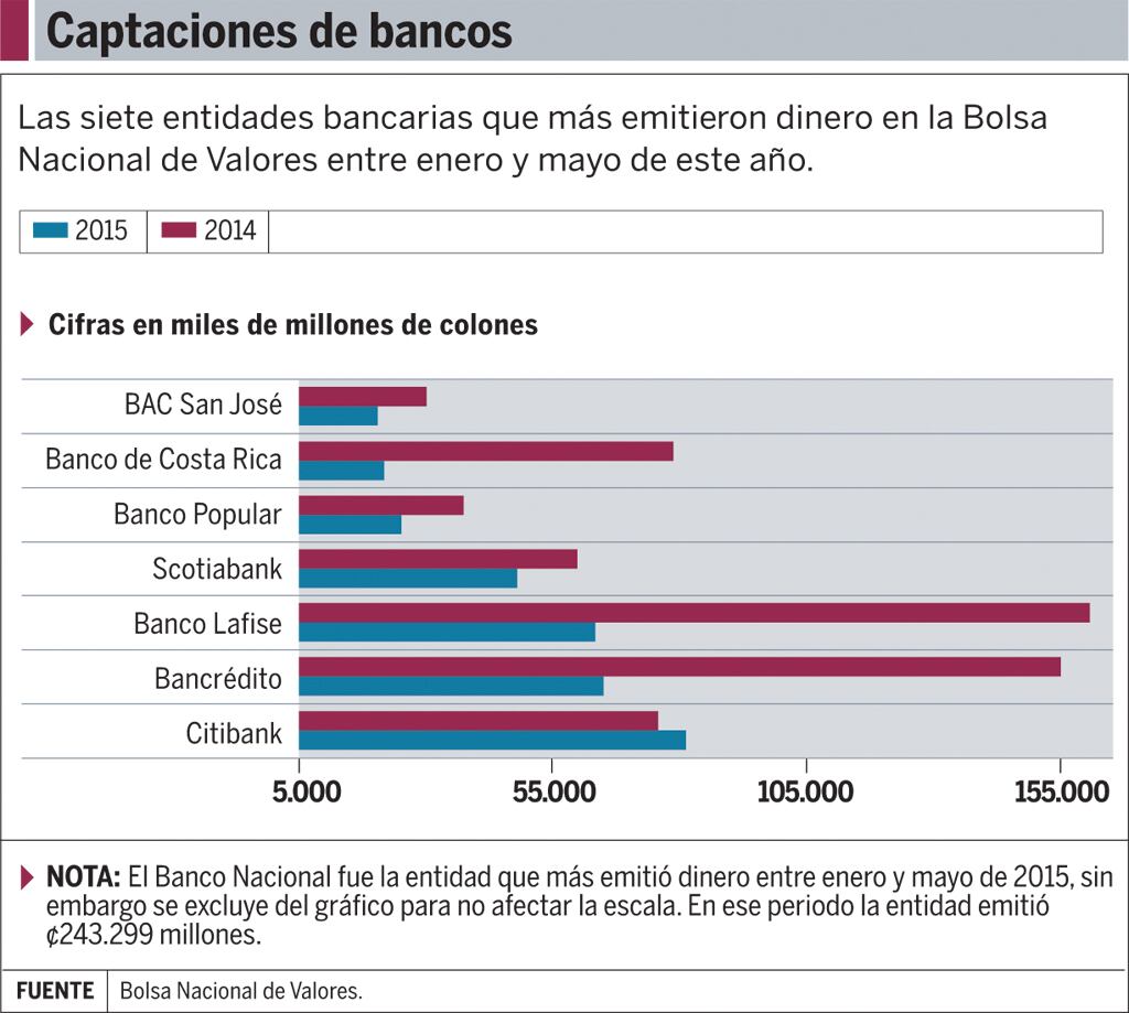 Entre enero y mayo de este año, las captaciones de entidades privadas en el mercado primario de la Bolsa Nacional de Valores (BNV) sumaron poco más de ¢659.400 millones, un 85,6% en colones, pero esa cifra es un 20% menor respecto al mismo periodo del 2014.