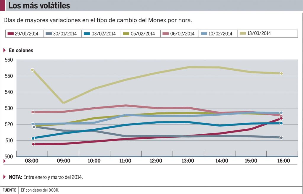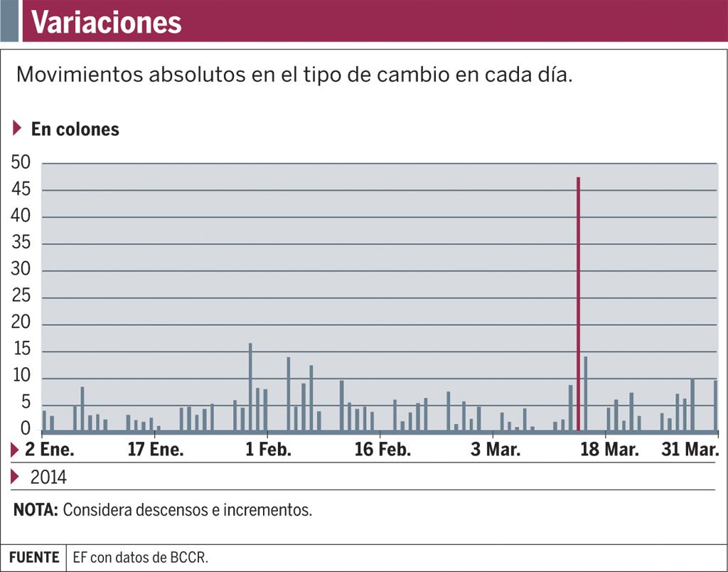 Los primeros tres meses del 2014 fueron convulsos para el tipo de cambio. La volatilidad llamó la atención del Banco Central (BCCR), pues hubo días en que el valor de la divisa subió ¢9 o bajó ¢21 en cuestión de 60 minutos.