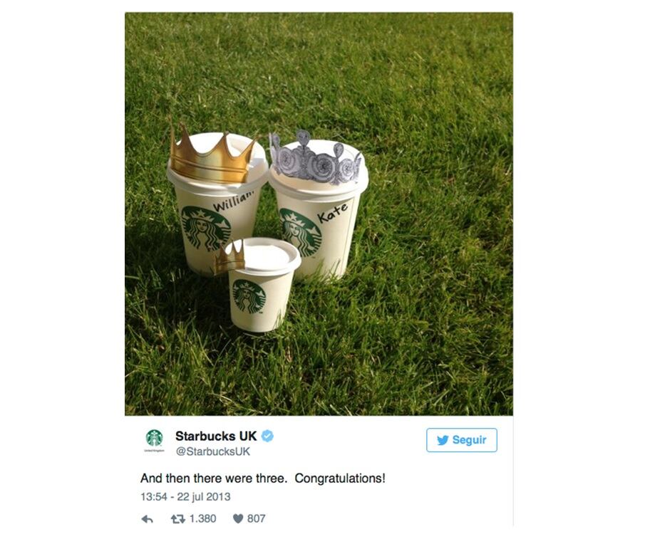 De igual manera, el nacimiento del bebé real en el 2013 fue aprovechado por Starbucks para generar un tuit que logró más de 1300 retuits.