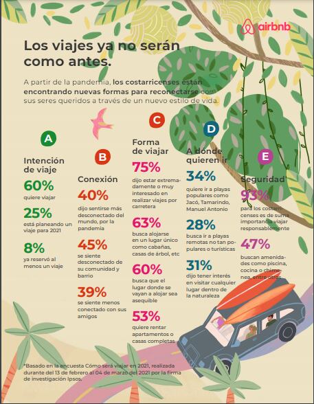 De acuerdo con un informe de la plataforma llamado Cómo será viajar en 2021, basado en 800 encuestas de opinión realizadas entre el 13 de febrero y el 4 de marzo de 2021 por la firma de investigación Ipsos, los viajes estarán entre los principales planes de los costarricenses.