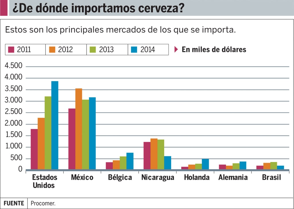 Datos brindados por la Promotora de Comercio Exterior de Costa Rica (Procomer) muestran que la importación de cerveza creció un 47% del 2011 al 2014.