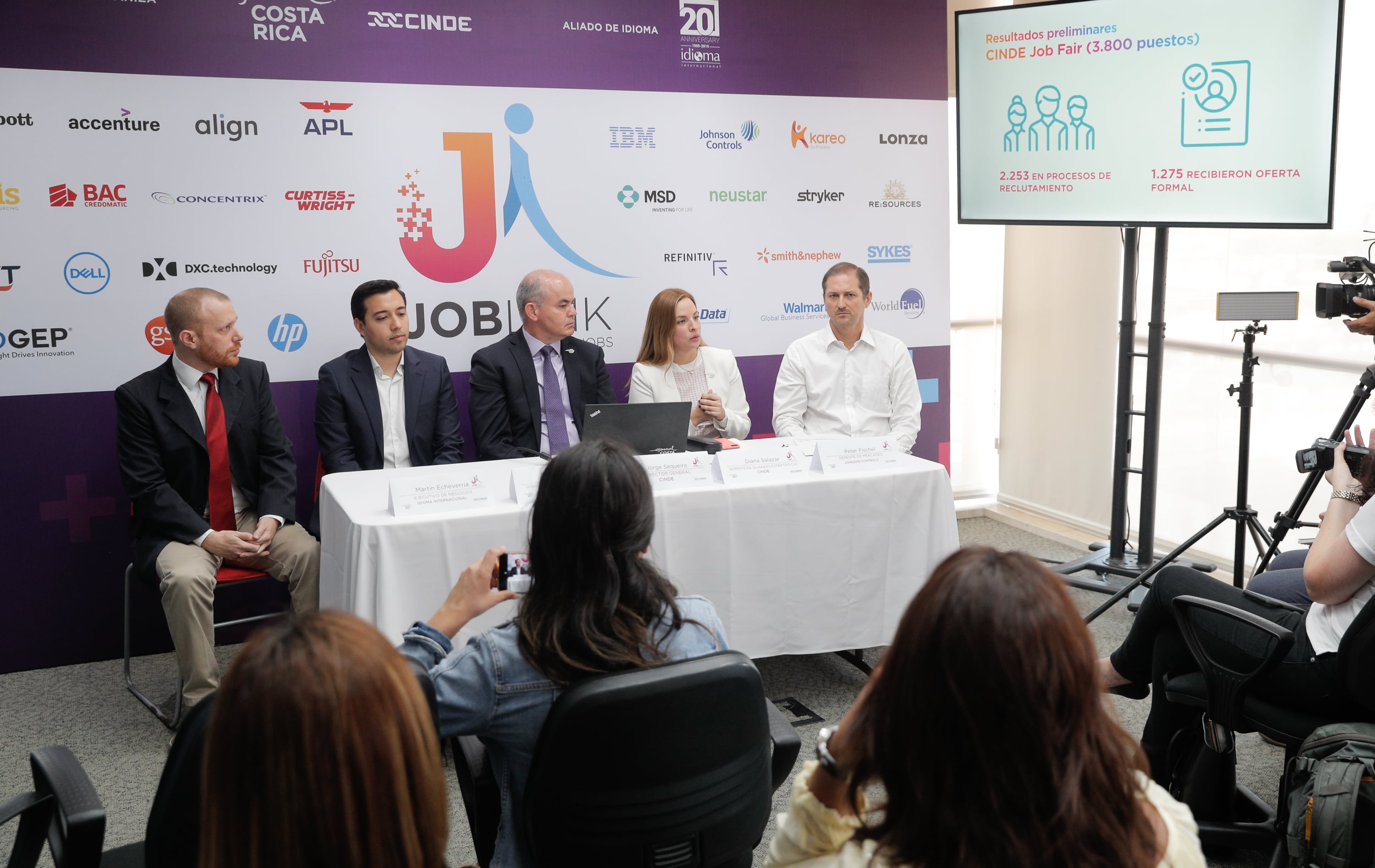 Cinde también entregó resultados preliminares de la Cinde Job Fair, celebrada del 22 al 24 de febrero. Diana Salazar, gerente de Alianzas Estratégicas de CINDE, explicó que en esa ocasión había 3.800 puestos disponibles, y un mes después (finales de marzo) 2.253 personas se encontraban en procesos de reclutamiento y otras 1.275 habían recibido ya una propuesta formal para ocupar un puesto.