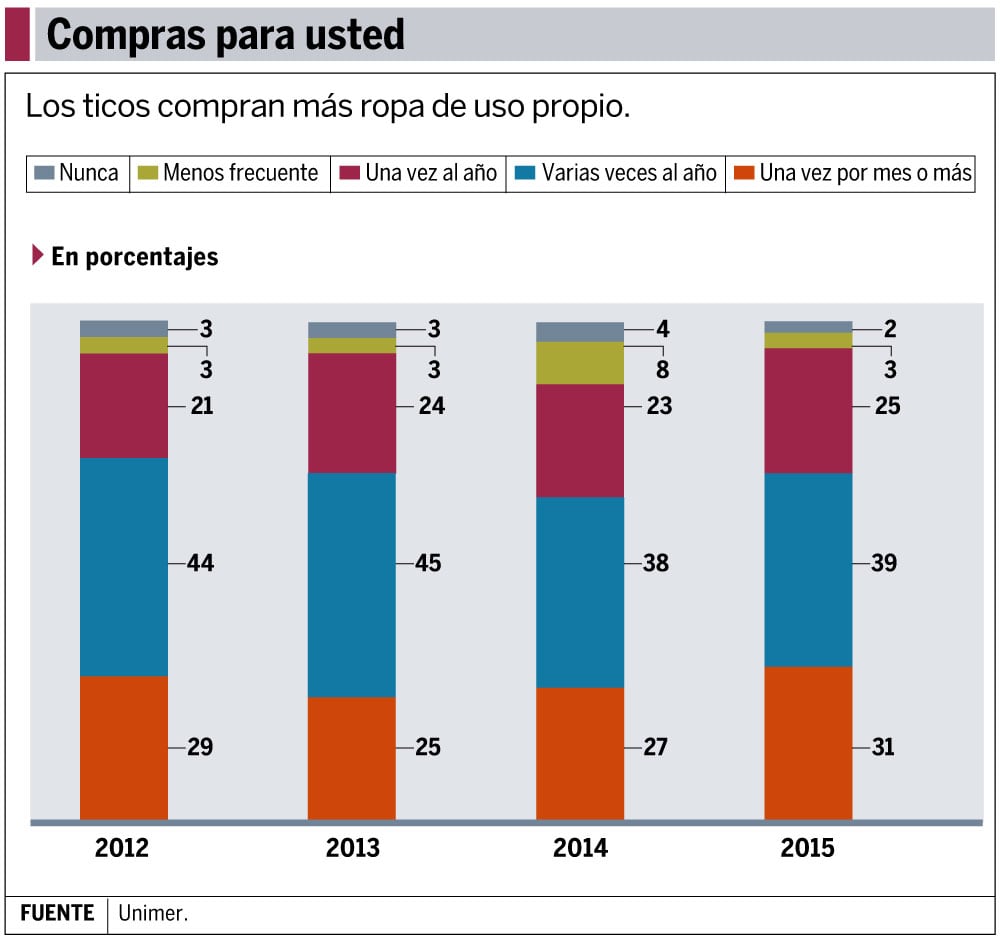 Por otra parte, cuando se trata de comprar ropa para otros, la frecuencia no sufrió grandes variaciones. Por ejemplo, en el 2014, un 21% indicó que adquiría prendas de vestir para los demás una vez por mes o más, mientras que para el 2015, esa cifra es del 22%.