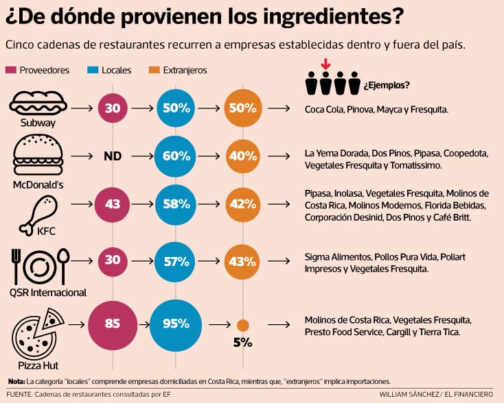 En las cinco franquicias consultadas por EF (Subway, McDonald’s, KFC, QSR Internacional y Pizza Hut) más del 50% de sus proveedores están domiciliados en Costa Rica.