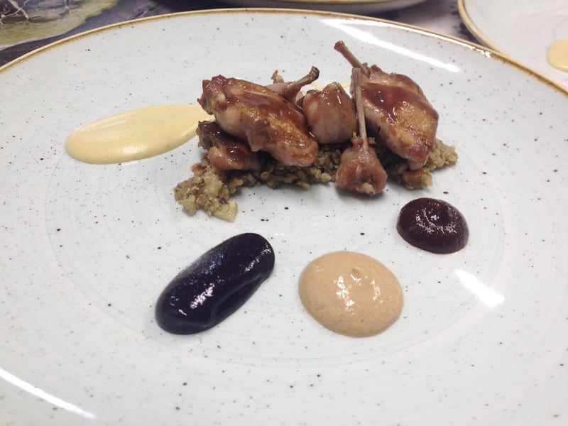 Codorniz asada, guiso de maíz cacahuazintle y quinoa, puré de cereza ahumada. Guillermo González Beristáin (Pangea).