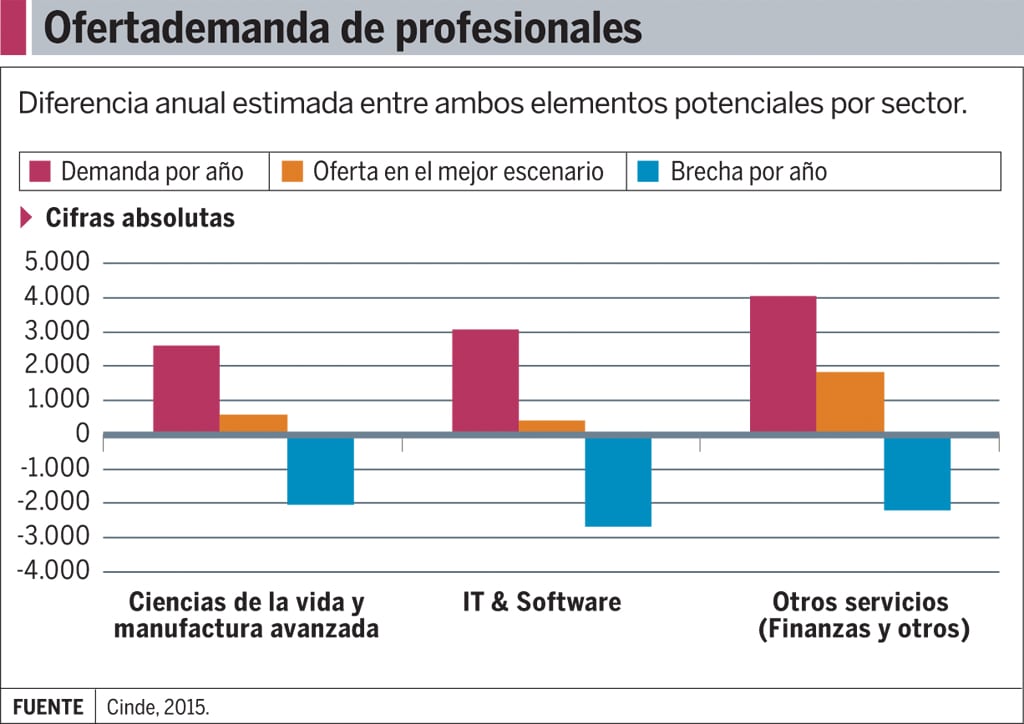 Lo anterior se desprende de una proyección de la Coalición Costarricense de Iniciativas de Desarrollo (Cinde) sobre la diferencia anual estimada entre oferta y demanda potencial de profesionales por sector, en este 2015. .