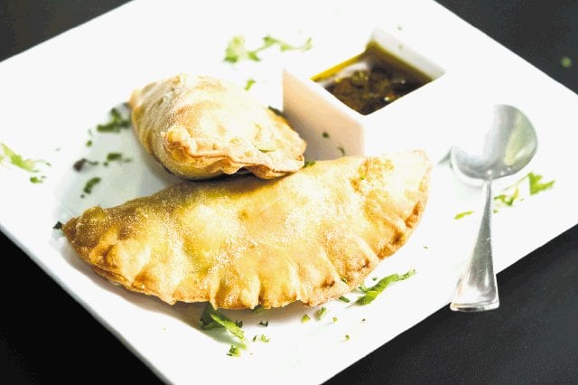 Empanaditas argentinas . Con cebolla, chile duce, aceitunas verdes, cebollino y huevo duro. Rica la pasta y excelente el relleno, con carne muy suave en trocitos.