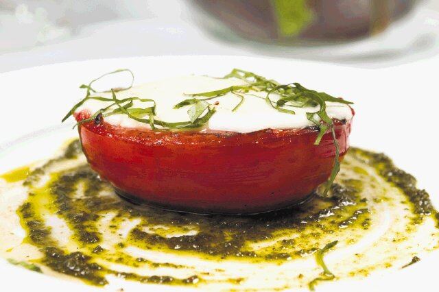 Caprese tibia . Tomates macerados en aceite verde, cubiertos con mozarella fresco, con hilos de albahaca, sobre espejo de pesto. Excelente y adictiva.