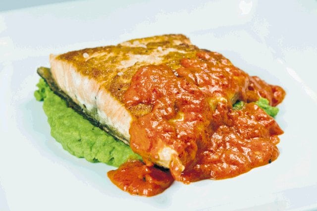 Salmón chileno en salsa de chile dulce . Magnífico el pescado, oportuna y agradable la combinación con el timbal de arvejas y tocineta que le servía de cama.
