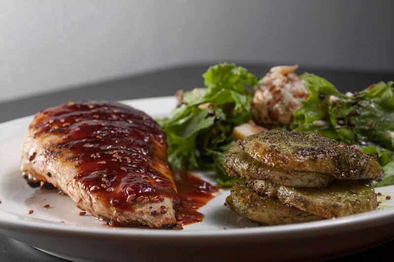Pollo en reducción de chipotles, vino tinto y miel de tapa. Pechuga jugosa. Se aprecian distintamente los tres sabores.