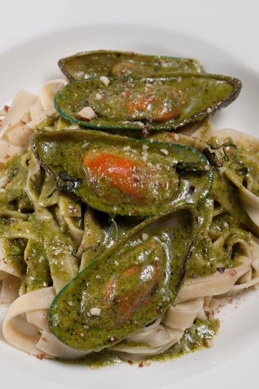 Tagliatelle con mejillones. Pasta fresca de la casa, bien lograda, con cuatro mejillones en crema de albahaca y parmesano.