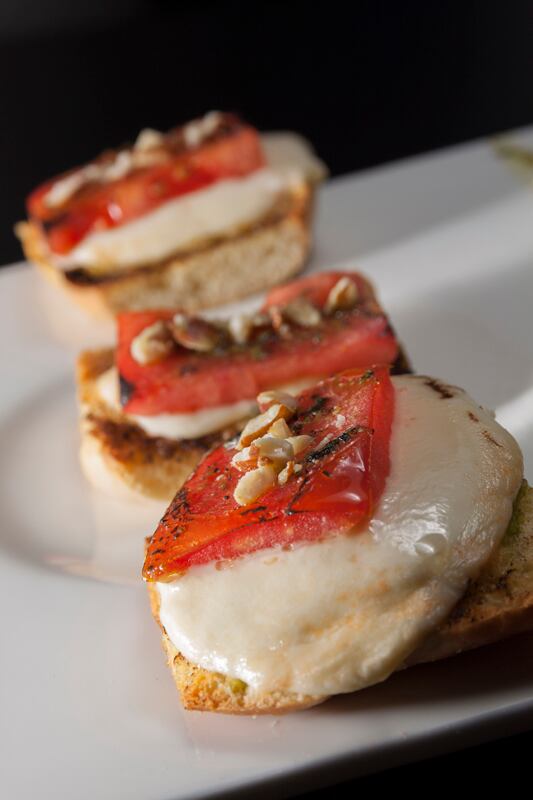 Bruscheta con mozarella, jamón y piñones. Sabrosa y de buen ver.