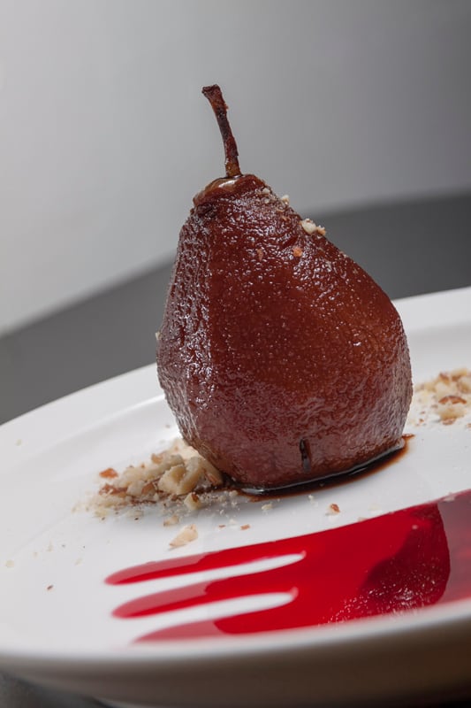 Pera chilena con vino Malbec. Se cocina a fuego lento por varias horas y se logra un excelente efecto, tanto visual como en las papilas gustativas.