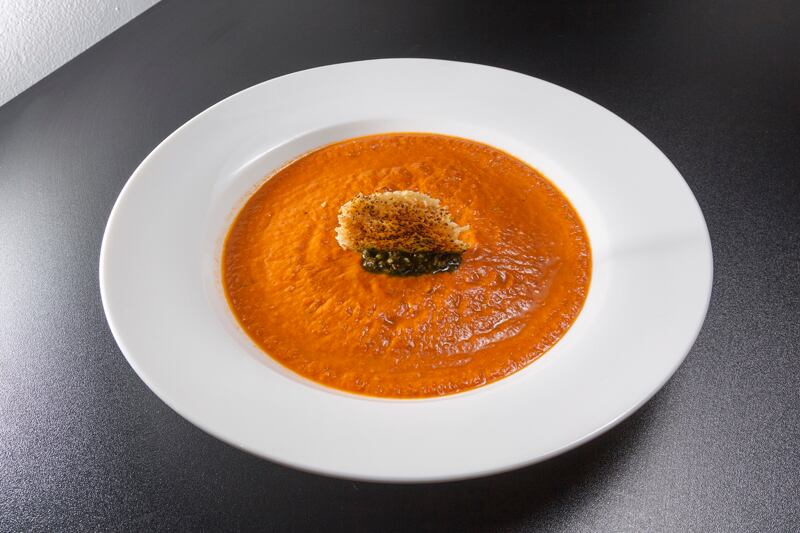 Crema de tomates rostizados. De gusto agradable, buena consistencia y un acierto el crocante de parmesano que la completa. Tibia al llegar a la mesa.