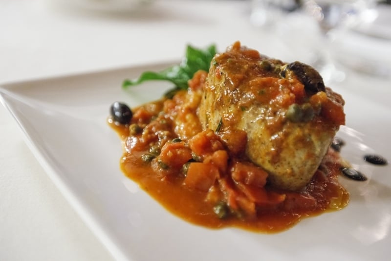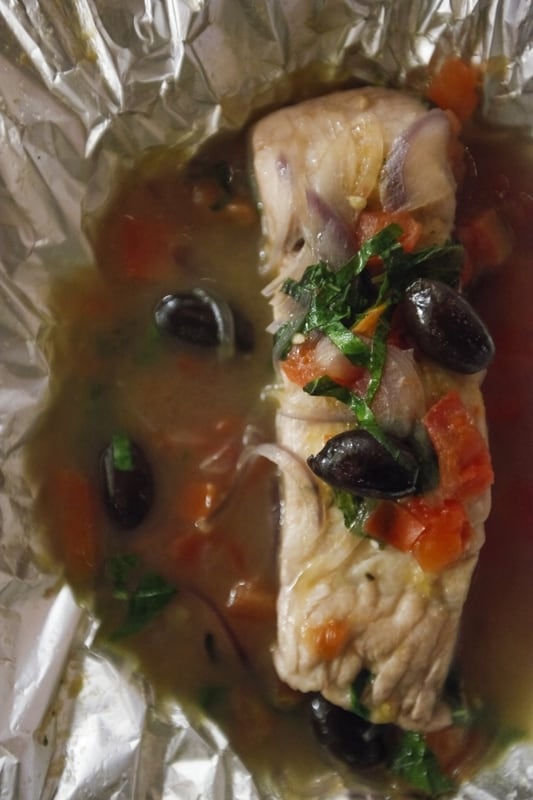 Filetto di branzino al cartoccio. Corvina al vapor con tomate natural, aceitunas kalamata, cebolla, orégano y vino blanco. Muy liviana y cumplió lo que promete el menú.