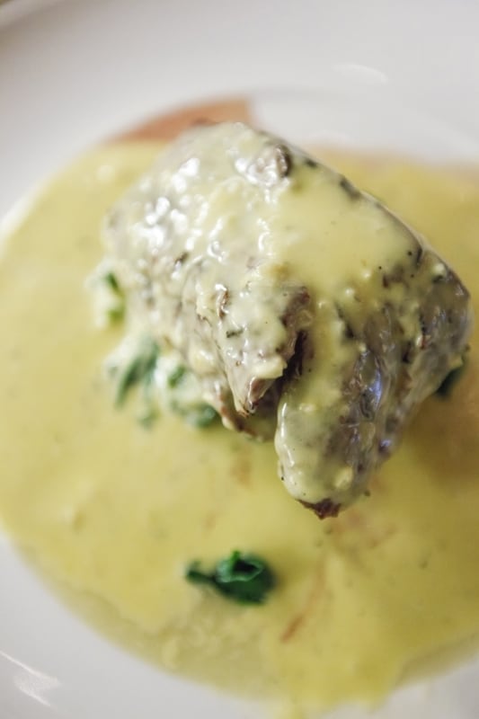 Filetto Gorgonzola. Lomito en su término justo, de gran suavidad y bien sellado en el exterior, con sabor a parrillada, sobre una base de espinacas salteadas, con consistencia firme. La salsa de Gorgonzola, sedosa y bien emulsificada, no se separaba el queso de la crema ni tenía grumos. Sabor distintivamente Gorgonzola, pero no abrumador.