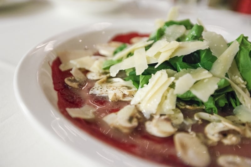 Carpaccio di carne. Con lascas de parmesano, Grana Padano , hongos y arúgula. Impresionante el emplatado, con abundantes lascas de quesos italianos en la parte superior. Delicioso.
