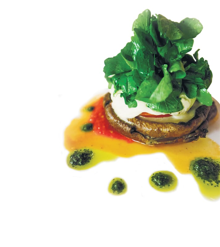 Portobello al forno. Mozarella , bocconcino, tomate y arúgula (rúcula) sobre un hongo portobello, de tamaño más que estándar, suavemente horneado.