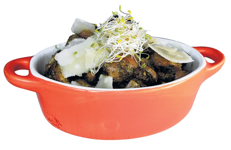 Champiñones al pesto . Abundante y exquisito, servido en una fuentecita honda, con lonjas de parmesano y frijoles nacidos por encima. La salsa, inmejorable.