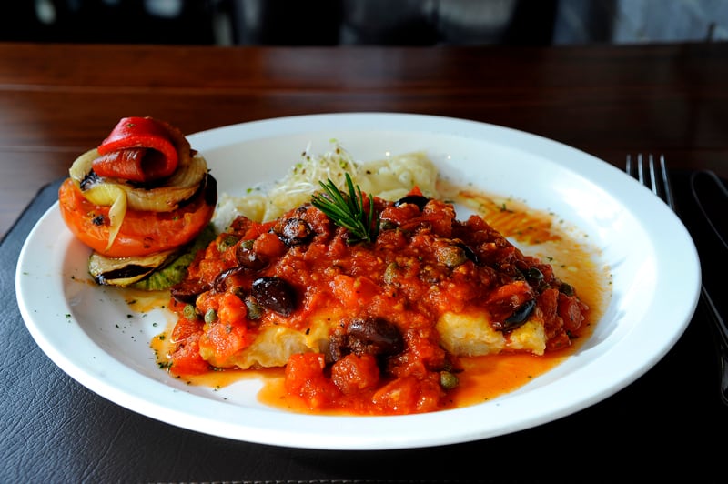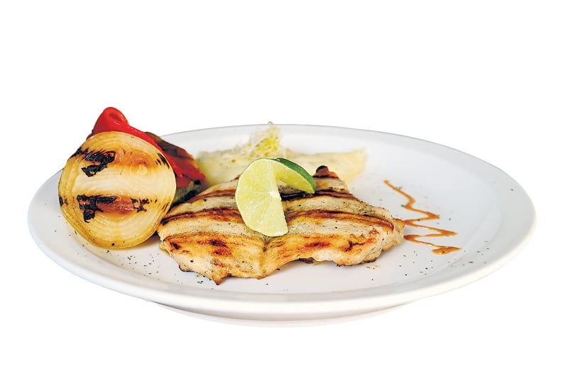 Corvina mediterránea. Con tomate natural, aceitunas negras y alcaparras. Acompañada de puré y vegetales asados. Tamaño considerable, muy buena salsa, el pescado fresco y cocinado justo lo necesario. Pechuga al grill . Acompañada de puré de papa y vegetales. Cumplidor, buen gusto y textura consistente sin estar recocido.