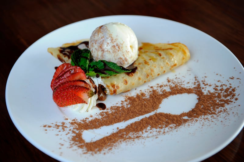 Crepa de dulce de leche con helado. Emplatado ingenioso y buena confección. Soufflé de chocolate, con corona de helado de vainilla. Es en realidad un volcán de chocolate, más que un soufflé . Al partirlo se derrama el chocolate líquido. Excelente.