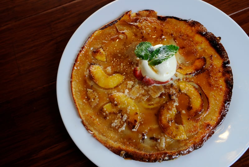 Panqueque de manzana. Un tanto hulosa la masa que rodea la manzana caramelizada. Tamaño como para compartir.