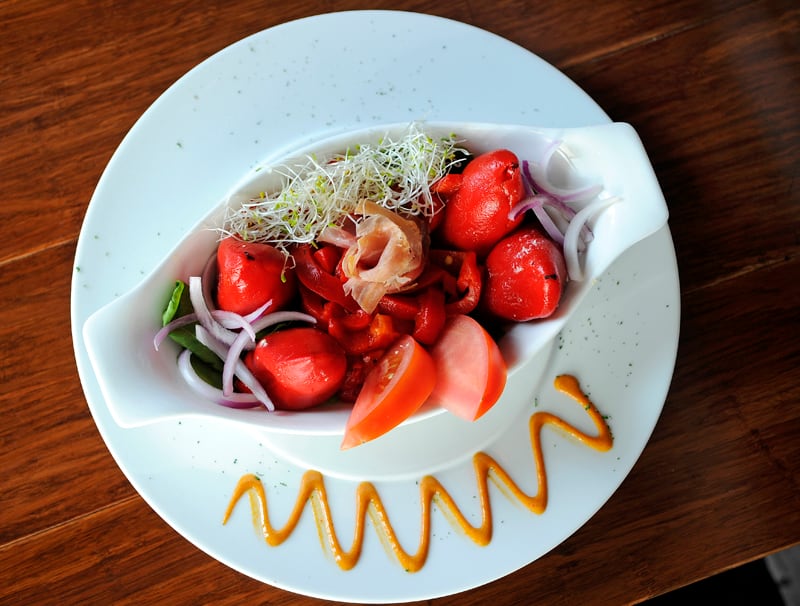 Fuente de pimientos. Varios pimientos cherry (o “mini”), no muy pequeños, rellenos de una delicada pasta de queso, acompañados de ensalada. Dulces, pero con un levísimo toque picante. Deliciosos.