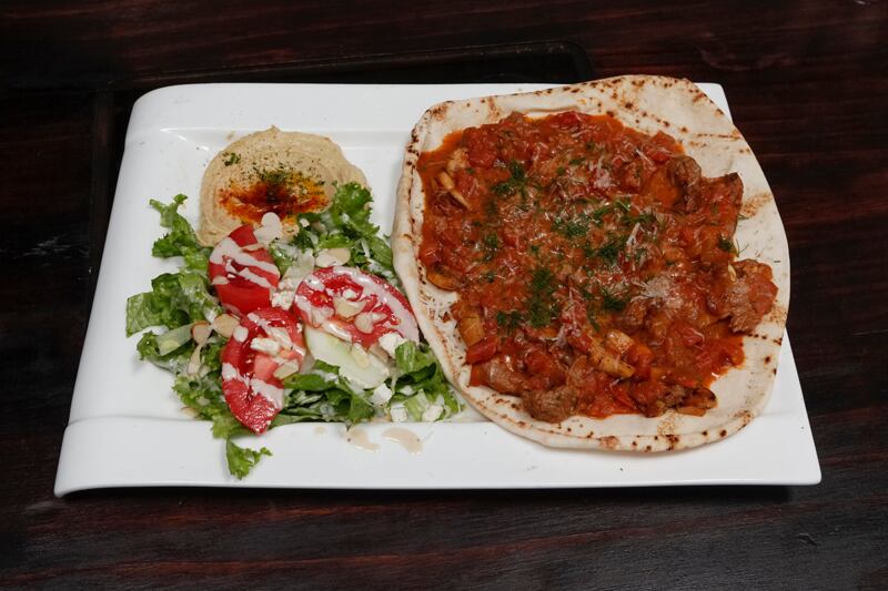Vaca tocanitza. Un estofado tradicional de los Balcanes. Rebanadas de carne de res cocidas con salsa de hongos, especias del chef y vino tinto, servida sobre “laffa”, con ensalada de queso feta y nueces y una porción de hummus. Original y reconfortante.
