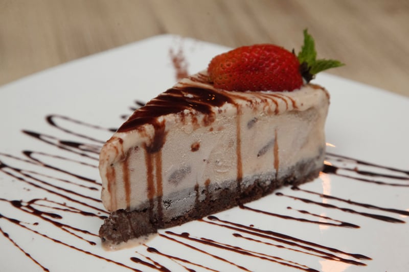Queque de chocolate con helado de mantequilla de maní. La combinación de ambos sabores es ideal. El gusto del helado hace notar que es hecho “en casa”. La textura del queque, un poco seca y quebradiza, pero lo húmedo del helado lo compensa.
