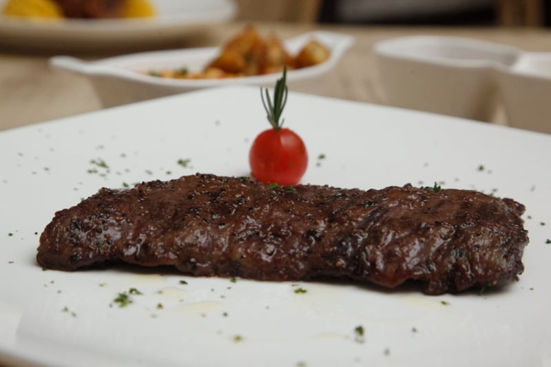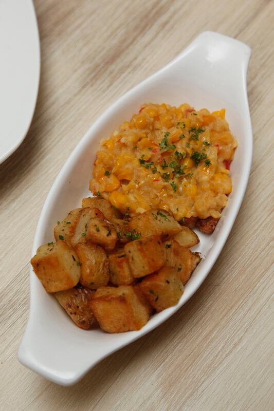 Entraña de ocho onzas. Tratada con sal y pimienta, puede ser un deleite para carnívoros. En la primera visita el camarero aconsejó a nuestro acompañante disfrutarla con una cocción no mayor al término medio. Sugerencia aceptada, la experiencia fue inmejorable, por el sabor y la delicadeza del corte. En la segunda visita, lamentablemente, se ordenó rosada y llegó un poco más cocida. No obstante, el gusto era muy bueno y estaba suave, por lo que nuestra invitada declinó la oferta del camarero de cambiarle el plato. Con tres salsas: bernesa, champiñones y pimienta (la más notable), acompañada de una rica cazuela de maíz dulce y papas.