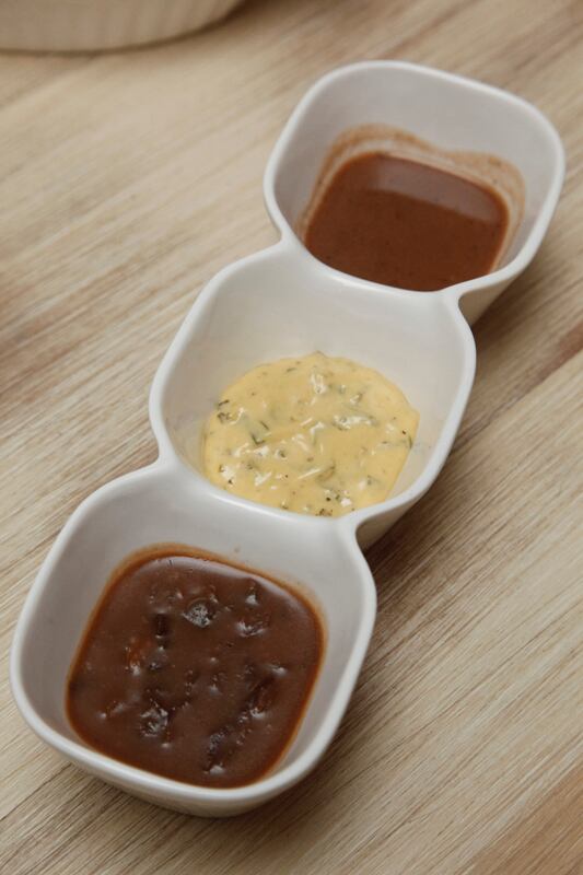 Corvina sobre cama de puré de brócoli, con hilos de salsa de morrón. Tierna por dentro, crujiente por fuera, perfectamente complementada por los acompañamientos.
