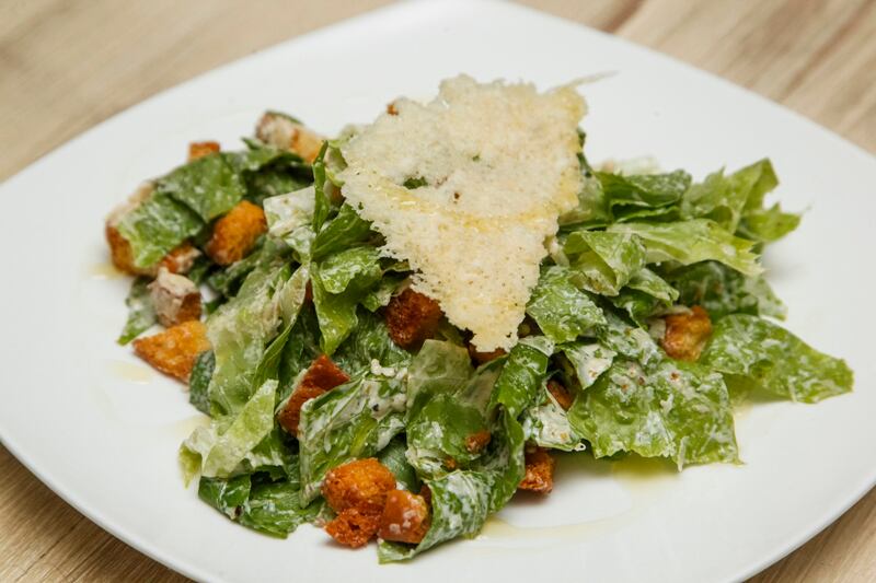 Ensalada César. Adornada con peineta de queso parmesano. Fresca la lechuga, sutil el aderezo. Hubiera preferido menos y más crujientes los crotones. Estos no están a la altura de los demás ingredientes, incluyendo las estupenda pastas hechas en casa.
