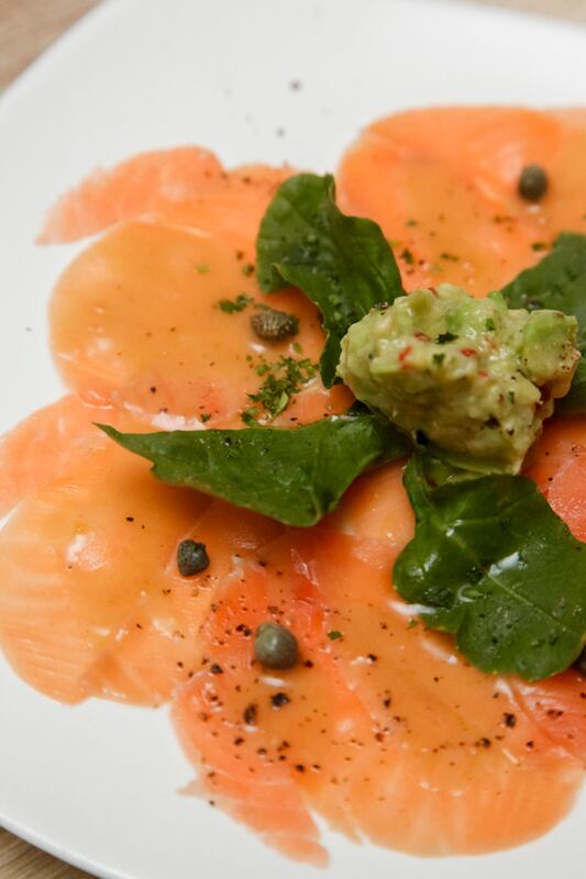 Carpaccio de res con queso parmesano. Una de las joyas del menú. La diferencia la hacen la reducción de balsámico con vino tinto y una pizca de puré de aguacate.