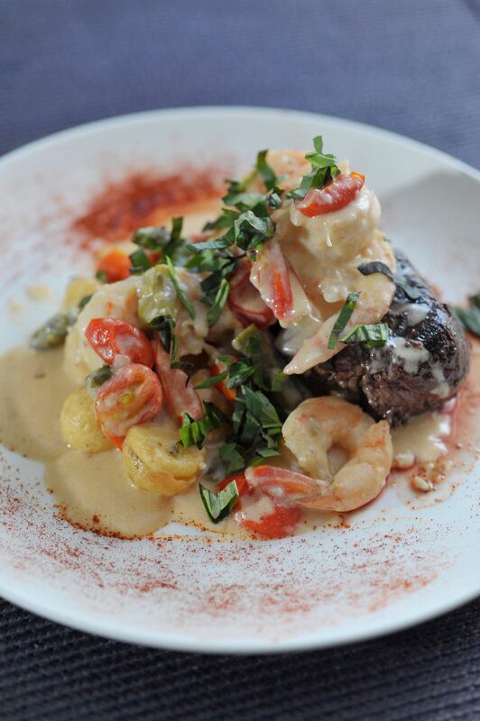Lomito Maradentro (300 g). A la parrilla, con camarones, espárragos, papitas noisette (bolitas de papa, blanqueadas y fritas) y tomatitos. Jugosa y gustosa la carne; muy buenos los camarones, firmes y consistentes. Acompañamientos bien incorporados.