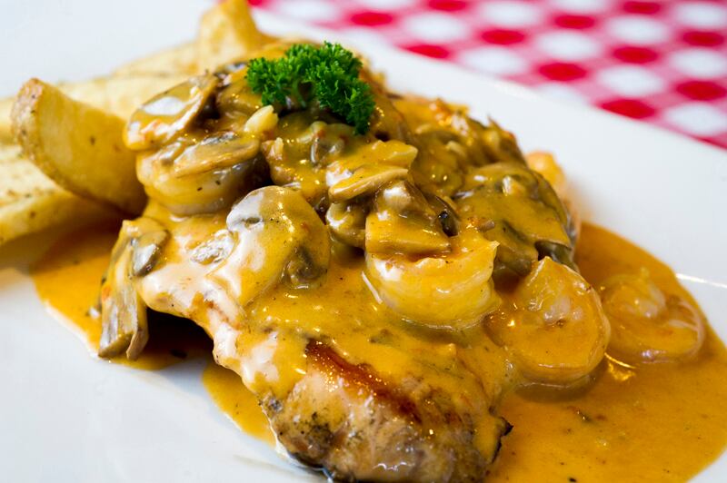Entraña (porción de 300 gramos). Inesperadamente vino en salsa de hongos; gusto agradable.