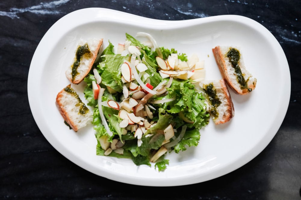 Ensalada bleu. Con manzana roja, almendras y tenue sabor a queso azul; los ingredientes no eran los del menú y pareció improvisada, pero sabía bien.